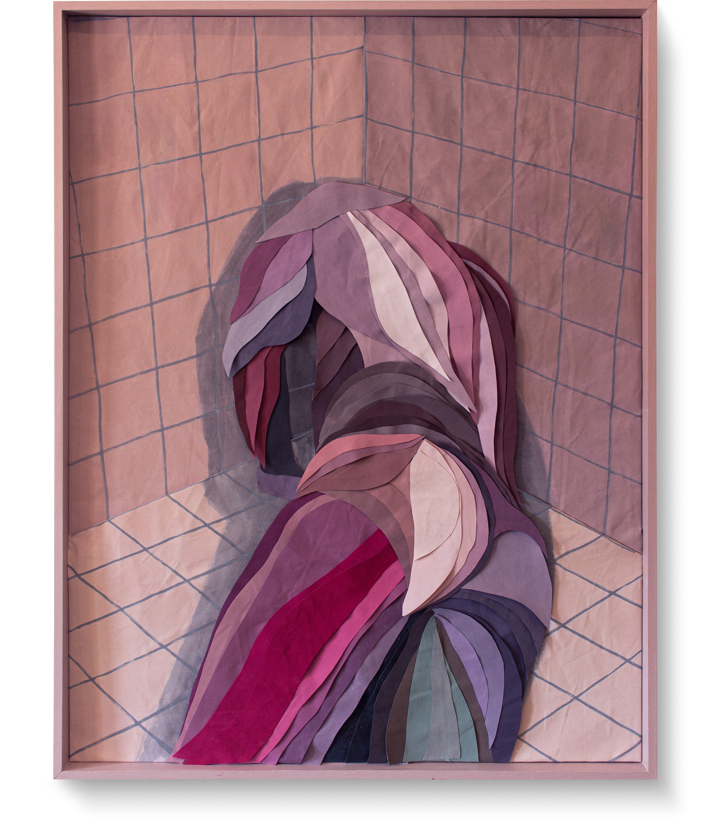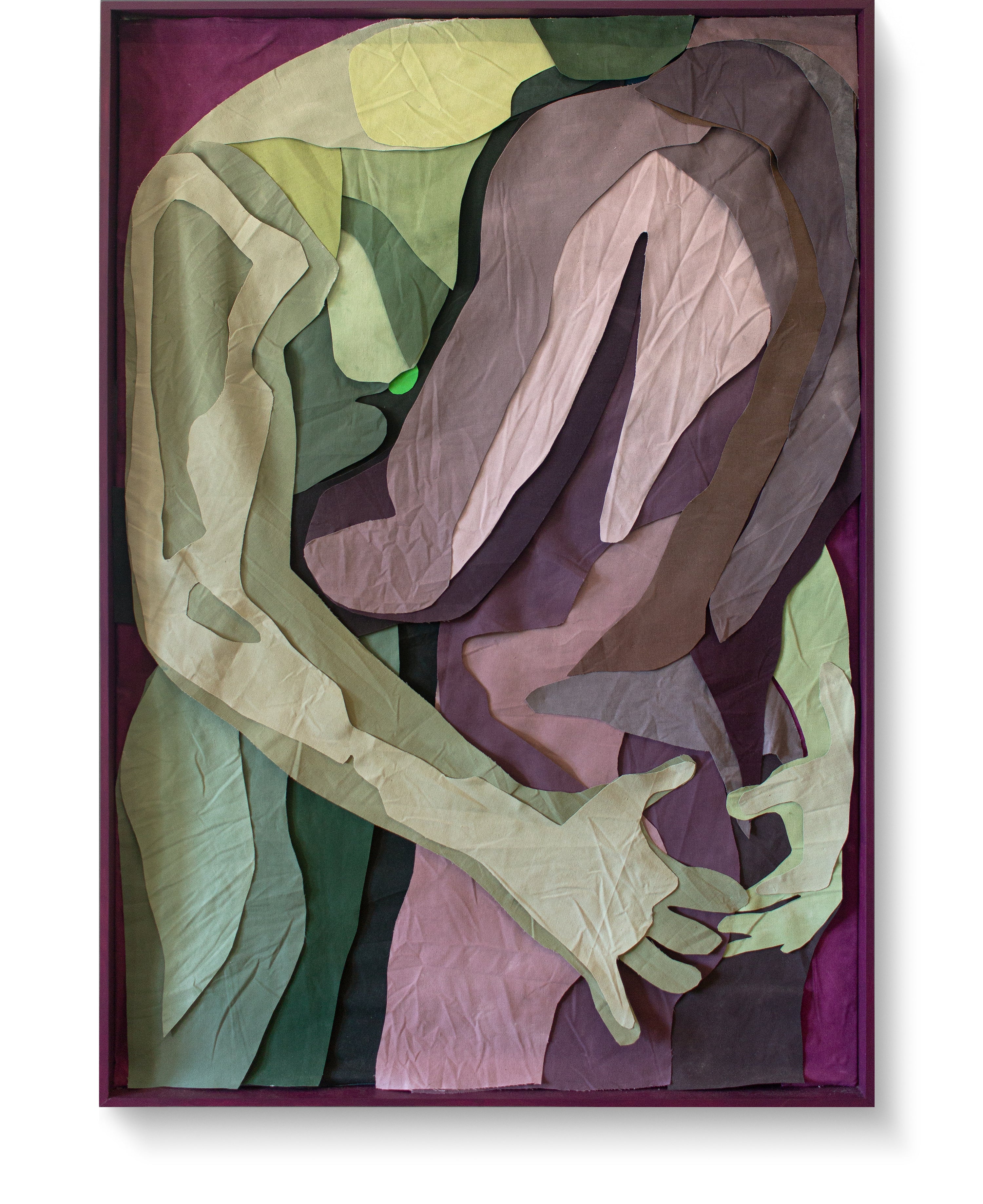 Detached is a series created during a period of deep depression and emotional isolation. Each work explores how casual sex, dating apps, and fleeting connections became a coping mechanism, offering brief comfort but often leaving a deeper sense of detachment. The subjects are based on real images sent to the artist through gay chat apps, transformed into layered fabric compositions that hang loosely, shifting with the air. The hand-painted, sewn fabrics reflect vulnerability and fragmentation, while the act of making became a self-soothing ritual during a time of personal recovery.