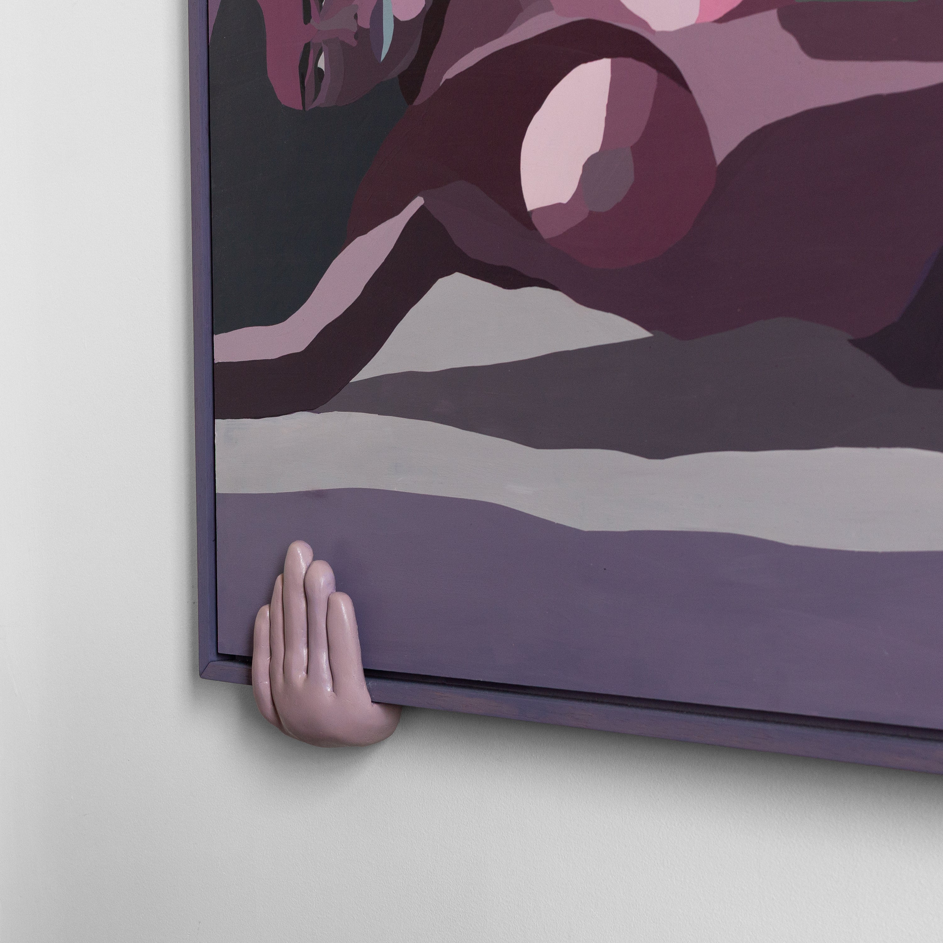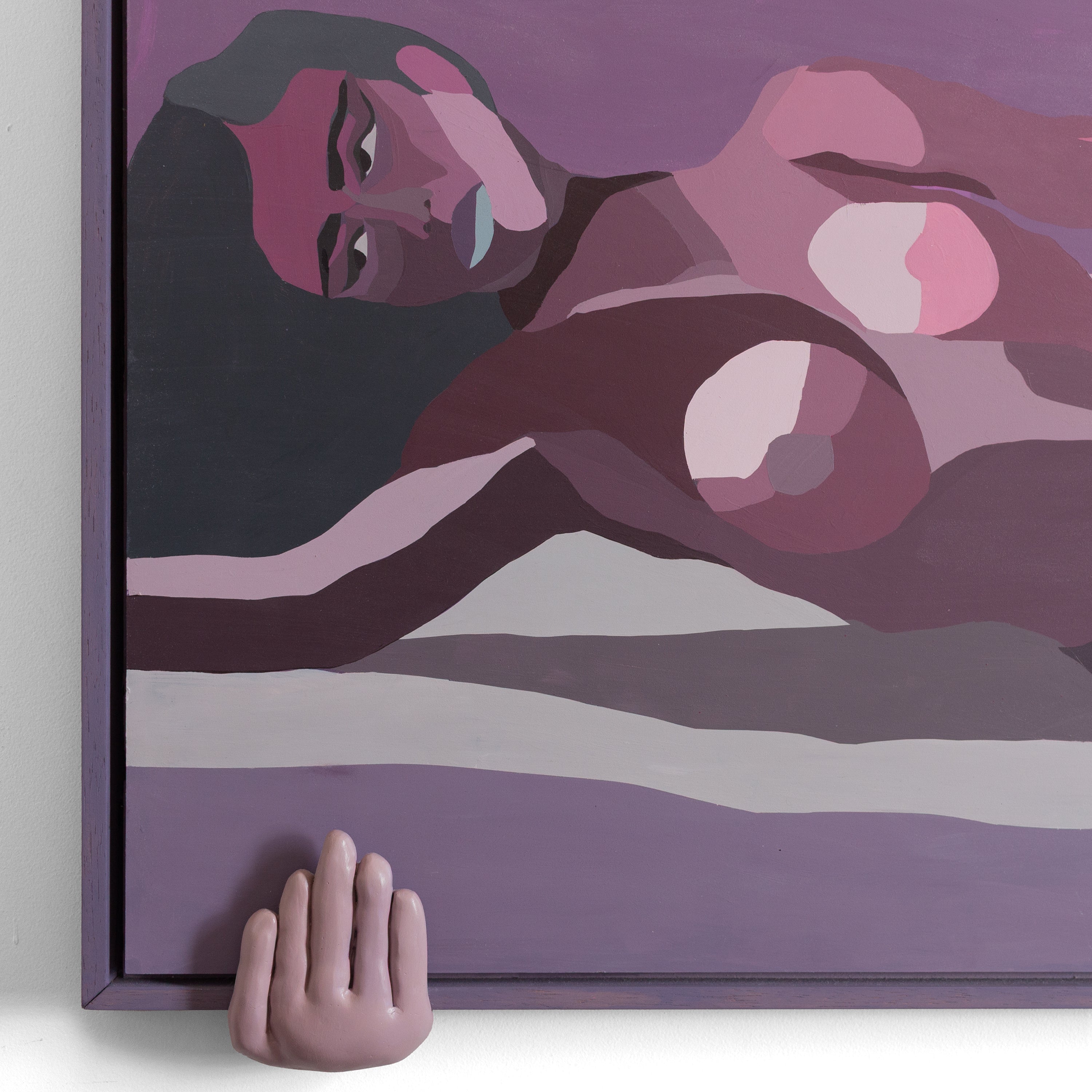 This piece depicts a woman taking a selfie, a moment of self-revelation and confidence after heartbreak, an intimate declaration of renewal and presence. The frame is held by plaster hands, suggesting care and support. These hands lift the work, bridging the subject and structure, and emphasising themes of vulnerability and empowerment within the Hung collection.